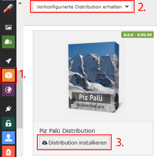 Gehen Sie dazu in die Verwaltungsoberfläche von TYPO3 und installieren Sie die Distribution Pizpalue. Dazu kann im linken Panel das Modul "Erweiterungen" ausgewählt werden.