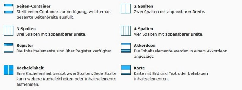 Mit Strukturelementen können Seitenbereiche feiner unterteilt werden. Typische Strukturelemente sind Spalten, Container, Register und Akkordeon.